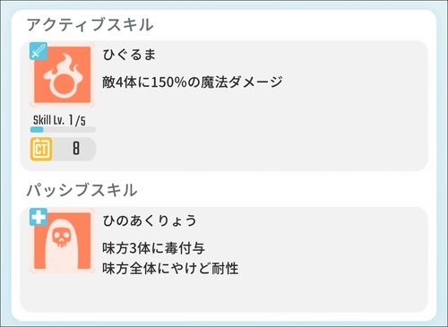 状態異常耐性・蘇生のスキルを持つサポート系のモンスターですが、能力としては一般的な星4モンスターといった内容。